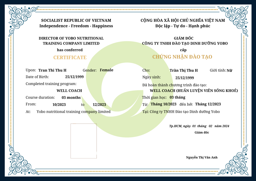 Chương trình Đào tạo HLV Dinh dưỡng/ Well Coach được đảm bảo chuyên môn bởi Trường Cao đẳng Công nghệ Y – Dược Việt Nam và Yobo Academy. Bạn sẽ được cấp Chứng chỉ độc quyền “Tư vấn, Xây dựng thực đơn & Huấn luyện viên Dinh dưỡng” của Trường Cao đẳng Công nghệ Y – Dược Việt Nam; Chứng nhận Well Coach Yobo Academy, mở ra hành trình phát triển sự nghiệp tại thị trường xanh và đầy tiềm năng này.